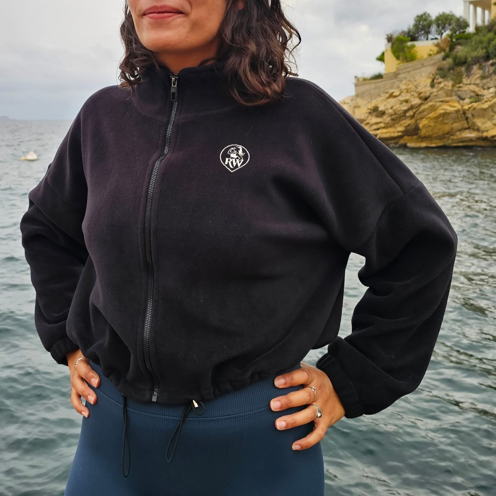 - Logo en silicone blanc mat, discret et élégant, positionné côté cœur de la veste