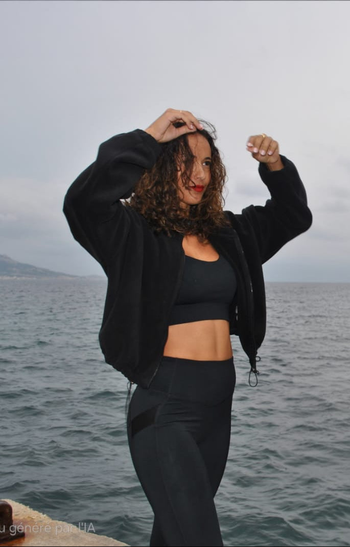 - Veste noire : intérieur doux et chaud, zip intégral, bas et poignets légèrement resserrés pour garder la chaleur.